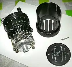 Die Curta besteht im Wesentlichen aus einer zentralen Welle, die die Funktion der Staffelwalze übernimmt und an deren oberen Ende die Kurbel angebracht ist, sowie aus dem Gehäuse, das die übrigen Elemente trägt.