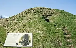 Der Cuween Hill Cairn liegt auf dem Cuween Hill, 800 m südlich vom Dorf Finstown, an der Bay of Firth auf Mainland einer Insel der Orkney in Schottland. Das Passage Tomb vom Maeshowe-Typ liegt am Ende eines Pfades, der am Osthang des Hügels, mit Blick auf die Bay, hinauf führt.