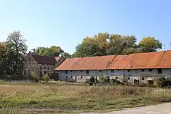 - Im Dorf befindet sich ein um 1735 im Barock erbautes dreistöckiges Schloss (Pałac). Über dem Eingang befindet sich das Wappen des Barons Zygmunt von Zeydlitz und Leipe (links) und seiner Frau Eleonora geb. Freiin von Czettritz und Neuhaus (rechts). Im Herrenhaus befanden sich vormals bedeutende Gemälde,[10] so unter anderem von Anton Graff. Seit 1845 diente das Gebäude, das heute eine Ruine ist, als adeliges Fräuleinstift der Familie von Zedlitz.