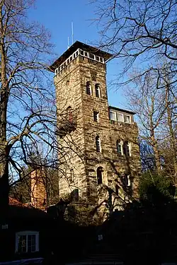 Auf dem Berg befindet sich ein 23 m hoher Aussichtsturm[15] aus dem 19. Jahrhundert und eine Gaststätte mit einem Biergarten. Der Bau wurde 1850 durch den Oberförster Walde aus Wuischke beim Stadtrat von Bautzen beantragt. Zunächst wurde der Turm nach dem Entwurf des Architekten Traugott Hobjan aus Bautzen durch den Malermeister Karl Traugott Eichler aus Lauba errichtet. Dieser wurde am 17. Mai 1851 vollendet und 1852 zusammen mit dem Wirtshaus eröffnet. Im Jahr 1856 wurde ein Brunnen fertiggestellt. Der steinerne Turm ist der älteste seiner Art in der Oberlausitz. Im Jahr 1928 erhielt der Turm einen hölzernen Aufbau, der jedoch am 19. Dezember 1944 abbrannte. Aufgrund seiner Nähe zu Bautzen und der guten Infrastruktur am Berg ist der Gipfel des Czorneboh ein beliebtes Ausflugsziel.