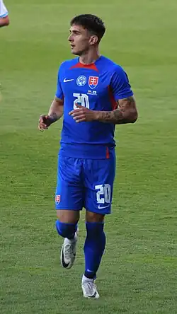 Sein Debüt im Trikot der slowakischen A-Nationalmannschaft hatte er am 22. September 2022 bei einer 1:2-Niederlage gegen Aserbaidschan in der Nations League 2022/23, als er in der 83. Minute für Matúš Bero eingewechselt wurde.[3] Nach einem weiteren Einsatz in diesem Wettbewerb und einem in einem Freundschaftsspiel wurde er in einigen Spielen der Qualifikation für die Europameisterschaft 2024 eingesetzt. Hier erzielte er beim 1:0-Sieg über Luxemburg am 16. Oktober 2023 sein erstes Länderspieltor.[4]