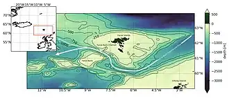 Der Island-Schottland-Überstrom (engl. Island-Scotland-Overflow-Water, ISOW), gebildet in der Norwegischen See, gelangt östlich von Island durch den ca. 850 m tiefen Färöer-Bank-Kanal mit 1,9 Sv[10] und weiter westlich über den flacheren Island-Färöer-Rücken in den Nordatlantik. Der Färöer-Bank-Kanal (FBC) ist die tiefste Passage über den Grönland-Schottland-Rücken; durch den Kanal fließt kontinuierlich dichtes Wasser über, was den Hauptteil des tiefen Wasseraustauschs zwischen dem Nordpolarmeer und dem Atlantik ermöglicht und so wesentlich zur globalen thermohalinen Zirkulation beiträgt.