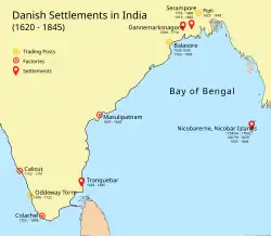 - Trankebar (bzw. Dänisch-Indien), Seehafen an der Koromandelküste, 1620 bis 1845