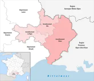 Lage des Departements Gard in FrankreichFinistèreCôtes-d’ArmorIlle-et-VilaineMorbihanLoire-AtlantiqueVendéeMancheMayenneOrneCalvadosMaine-et-LoireSartheIndre-et-LoireVienneDeux-SèvresIndreLoir-et-CherEureEure-et-LoirSeine-MaritimeOiseAisneSommePas-de-CalaisNordArdennesMarneMeuseMeurthe-et-MoselleHaute-MarneVosgesMoselleEuropäische Gebietskörperschaft ElsassEuropäische Gebietskörperschaft ElsassTerritoire de BelfortCherLoiretYonneAubeCôte-d’OrNièvreHaute-SaôneEssonneYvelinesSeine-et-MarneVal-d’OiseHauts-de-SeineVal-de-MarneSeine-Saint-DenisParisDoubsJuraSaône-et-LoireAllierCreuseHaute-VienneCharenteCharente-MaritimeCorrèzeDordogneGirondePuy-de-DômeLoireRhôneAinHaute-SavoieCantalLotSavoieHaute-LoireIsèreArdècheLandesLot-et-GaronneHautes-AlpesDrômeAlpes-MaritimesVarAlpes-de-Haute-ProvenceVaucluseBouches-du-RhôneGardHéraultLozèreAveyronTarnTarn-et-GaronneGersPyrènèes-AtlantiquesHautes-PyrénéesAudePyrénées-OrientalesHaute-GaronneAriègeKorsikaKorsikaVereinigtes KönigreichAndorraGuernseyJerseyNiederlandeBelgienLuxemburgDeutschlandLiechtensteinMonacoÖsterreichSchweizItalienSpanien
