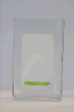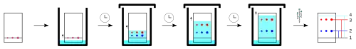Das Fließmittel saugt sich nun über Kapillarkräfte in die stationäre Phase nach oben. Sobald die Flüssigkeit die Startlinie erreicht hat, lösen sich die Substanzen in ihr. Die Moleküle sind nun den Anziehungskräften der stationären Phase einerseits und den Anziehungskräften der mobilen Phase andererseits ausgesetzt. Je nach Kräfteverhältnis bleibt ein Teilchen eher am Startpunkt oder es wandert mit der mobilen Phase nach oben. Je unpolarer das Fließmittel und je polarer eine Substanz, desto weniger wandert die Substanz. Die Lösungsmittelpolarität ist dabei analog wie in der Säulenchromatographie.