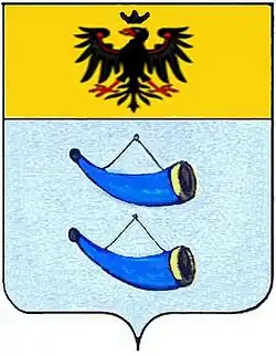 Wappen: „Zwei silberne Jagdhörner, blau verfärbt, gefüttert, garniert und mit Gold abgebunden, übereinander angeordnet; darüber ein goldenes Feld mit schwarzem Adler mit ausgebreiteten Flügeln und schwarz gekrönt.“