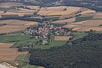 Etwa 1,5 Kilometer südwestlich der Dorfmitte, am östlichen Abhang des 392 m ü. NN hohen Hügelskopfs (früher Heidelbergskopf), befand sich einst die Siedlung Oberdabelshusen (Oberdagobertshausen), die im Dreißigjährigen Krieg zur Wüstung wurde.[9] Geringe Reste und Fundamente findet man heute noch vor dem großen Krater des ehemaligen Basaltsteinbruchs.