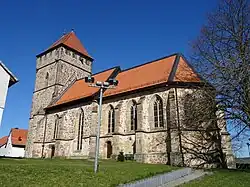 Die heutige, für ein kleines Dorf recht gewaltige gotische Kirche mit ihrem wuchtigen Kirchturm und dem einschiffigen Langhaus wurde in der Zeit um 1403 bis 1411 erbaut. Der wuchtige Kirchturm war offensichtlich einst eine Bergwarte. Das oberste Geschoss des quadratischen, massiven Glockenhauses kragt etwas hervor und hat auf jeder Seite vier gleichartige Schießöffnungen. Anstelle des heutigen Walmdaches befand sich dort ursprünglich wohl eine Art Plattform, von der aus die Besatzung die Umgebung beobachten und sich gegebenenfalls verteidigen konnte. Wasserspeier am Fußgesims dieses Geschosses in der für eine Dorfkirche recht aufwendigen Form von speienden Tieren lassen diesen Schluss zu.