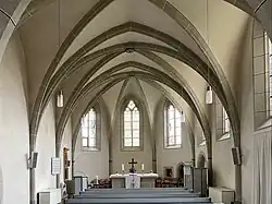 Das Erdgeschoss des Turms, das Langhaus und der Chor sind von Kreuzgewölben überspannt. An den Wänden des Kirchenschiffs befinden sich im oberen Bereich Reste frei gelegter Rankenmalereien sowie Schriftzüge. Im Chor ist ein Sakramentshäuschen aus dem 15. Jahrhundert mit Kreuzigungsrelief erhalten. Die ehemals vorhandenen wertvollen Glasmalereien der spitzbogigen Fenster sind teilweise in den Fenstern der Löwenburgskapelle in Kassel angebracht, teilweise liegen sie, nicht mehr zusammensetzbar, im Keller des Hessischen Landesmuseums in Kassel.[12]