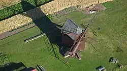 Blasonierung: „In Gold auf grünem Berg eine schwarze Bockwindmühle. Der Berg ist belegt mit einem silbernen Schildchen, darin eine rote, vierendige Geweihstange.“[4] |