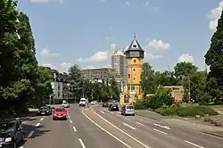 | Darmstädter Landstraße an der Sachsenhäuser Warte, Blick nach Norden. Im Hintergrund das Hochhaus des Leonardo Royal Hotels | |