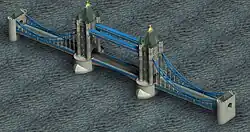 - Frontalperspektive ist eine Zentralprojektion eines Objektes mit drei wesentlichen zueinander orthogonalen Richtungen (z. B. Quader, Haus), wobei zwei dieser Richtungen parallel zur Bildtafel verlaufen und damit deren Fluchtpunkte im „Unendlichen“ liegen. Man nennt so eine Ansicht auch Perspektive mit einem Fluchtpunkt (s. Bild). Der eine besondere Fluchtpunkt ist in der Regel der Hauptpunkt. Der Vorteil einer Frontalperspektive: Alle ebenen Figuren in Ebenen parallel zur Bildtafel werden nur skaliert, aber unverzerrt, abgebildet (s. Beispiele: Brücke und Haus in Frontalperspektive).