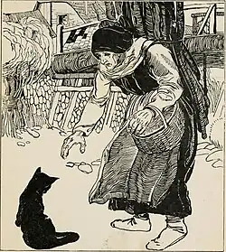 Eine arme Frau holt Holz und findet ein krankes Kätzchen. Sie trägt es in der Schürze heim, gibt es auch nicht den Kindern, sondern legt es weich und gibt ihm Milch. Die Katze wird gesund und ist plötzlich fort. Als die Frau wieder Holz holt, steht da eine feine Dame, winkt sie her und wirft ihr fünf Stricknadeln in die Schürze. Die Frau wundert sich, doch sie stricken ihr zum Lohn jede Nacht ein Paar Strümpfe.