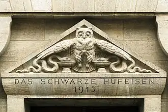Über dem Hauseingang zeigt das Hauszeichen in einem Dreieck eine Eule ein nach oben-unten mit den Krallen haltendes Hufeisen und mit den Flügeln zwei Schlangen überdeckend. Die Inschrift darunter lautet: DAS SCHWARZE HUFEISEN | 1913.