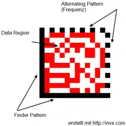 - Diese paarweise Kombination durchgehender und unterbrochener Linien in beiden Richtungen waagerecht und senkrecht erleichtern die Bildauswertung. Sie unterteilen große Datenfelder bei Codes mit mindestens 32 Modulen Kantenlänge in gleich große Teile.