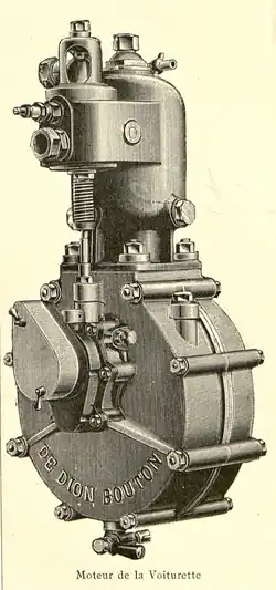 De Dion und Bouton entschieden sich für die Entwicklung von Benzinmotoren, nachdem sie auf der Pariser Weltausstellung von 1889 die Ottomotoren von Gottlieb Daimler besichtigen konnten.[4] Der Graf de Dion beschäftigte zwischen 1890 und 1893 den Ingenieur Delalande mit Entwürfen und Vorarbeiten für einen Verbrennungsmotor. Delalande arbeitete in einer von de Dion finanzierten Werkstatt außerhalb des Unternehmens. Der Motor wurde bereits 1890 patentiert[5]; Georges Bouton scheint schon früh über die Arbeiten am Motor im Bilde gewesen zu sein. Trépardoux, der an der Weiterentwicklung von Dampfmaschinen festhalten wollte, schied 1893 im Streit aus dem Unternehmen aus, nachdem er zuvor die grundlegenden Arbeiten für eine Hinterachse fertiggestellt hatte, die konform mit seinem Arbeitsvertrag vom Unternehmen patentiert wurde und als De-Dion-Achse jahrzehntelang sehr verbreitet war.