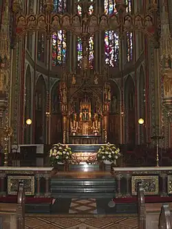 Die Bleiglasfenster sowie der Hochaltar und Baldachin und zahlreiche andere Elemente der Innenausstattung stammen aus der Kölner Werkstatt Friedrich Wilhelm Mengelberg und entstanden in den Jahren 1882 bis 1886. Aus der gleichen Werkstatt stammt die Chorschranke, die den Altarraum in der Höhe durch eine Blende vom Gemeinderaum trennt: Sie zeigt Einzeldarstellungen der zwölf Apostel und wird von einer Kalvariengruppe überragt, bei der Mengelberg überwiegend der mittelalterlichen Ikonographie folgte. Das linke Seitenschiff mündet in eine Marienkapelle, deren Hochaltar wiederum aus Mengelbergs Atelier (1885) stammt und Szenen des Marienlebens in mittelalterlichen Darstellungsformen schildert.