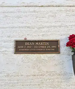 Dean Martin starb am 25. Dezember 1995 im Alter von 78 Jahren an den Folgen seiner Krebserkrankung. Am Tag seines Todes wurden die Straßen und Gebäude in Las Vegas für zehn Minuten verdunkelt.[65] Martin wurde am 28. Dezember 1995 auf dem Pierce Bros. Westwood Village Memorial Park Cemetery in Los Angeles beigesetzt.