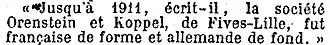 ↑„Bis 1911 … war O&K aus Fives-Lille der Form nach französisch und dem Wesen nach deutsch.“ „Bis 1911 war die Firma O&K aus Fives-Lille der Form nach französisch und ihrem Wesen nach deutsch.“ Sie wurde von zwei deutschen Direktoren geleitet: Herr Franken war der technische Direktor und Herr Neisser war der kaufmännische Direktor. Was die Fabrik Fives-Lille betrifft, so waren am Vorabend der Kriegserklärung, im Juli 1914, von rund dreißig Mitarbeitern, die dort beschäftigt waren, knapp zwanzig deutsche Staatsangehörige.