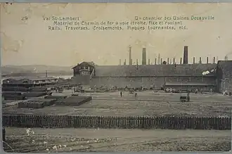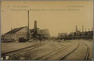 Die Fabrikanlagen von Val-Saint-Lambert in der Gemeinde Seraing bei Lüttich bestanden aus Büro- und Betriebsgebäuden, Wohnhäusern, Dampfmaschinen, Kesseln und einer Verbindungsbahn, die eine Gesamtfläche von 1,26 Hektar einnahmen. Sie lagen zwischen der Eisenbahnstrecke von Lüttich nach Namur, einem Treidelpfad der Maas, dem Werk der KommanditgesellschaftLes Petits Fils de François de Wendel (De Wendel’sche Berg- und Hüttenwerke) und der Rue de Flemalle.[3]
