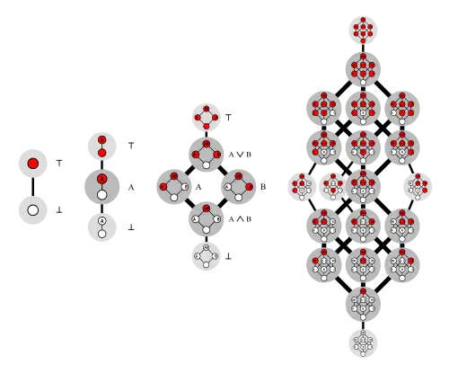 Eine dritte äquivalente Beschreibung dieser Anzahl verwendet Verbandstheorie. Für je zwei -stellige, monotone boolesche Funktionen und erhält man zwei weitere solche Funktionen, nämlich und , das heißt deren logische Konjunktion und Adjunktion. Die Menge der -stelligen, monotonen booleschen Funktionen bildet mit diesen Operationen einen distributiven Verband. Es handelt sich um den distributiven Verband, der sich gemäß dem Darstellungssatz von Birkhoff aus der partiell geordneten Menge ergibt, die durch die Teilmengen einer -elementigen Menge mit der Inklusion als Ordnung entsteht. Diese Konstruktion erzeugt den freien distributiven Verband mit Erzeugenden. Die Dedekind-Zahl ist also die Anzahl der Elemente des freien distributiven Verbandes mit Erzeugenden.[6][7][8]