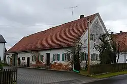 Das erdgeschossige Wohnstallhaus mit Satteldach ist ein verputzter Backsteinbau.