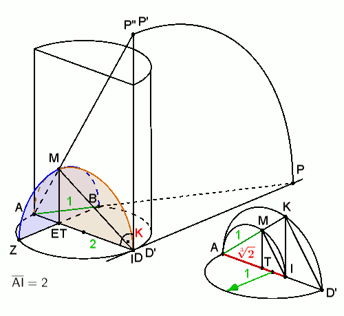 Im nebenstehenden Bild ist die Kantenlänge des Ausgangswürfels bzw. das – in einer separaten Konstruktion bestimmte – geometrische Mittel von und . Sporus zeigt als Lösung die Verhältnisgleichung