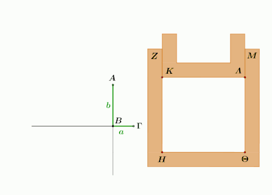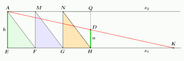 - Ich ziehe eine beliebige Linie, K A = a, halbiere sie in C und ziehe um den Mittelpunkt K mit Abstand K C einen Kreisbogen, ich bestimme C X = b und ziehe eine gerade Linie durch A X und eine durch C X, ich markiere E Y = C A, sodass eine gerade Linie durch E Y sowie durch den Punkt K gehen kann. [...][28]