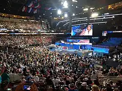 Die Democratic National Convention fand vom 25. bis zum 28. Juli 2016 in Philadelphia statt, mehrere Wochen früher als bei den beiden vorherigen Wahlen.[9] Auf ihr ist Hillary Clinton offiziell zur Präsidentschaftskandidatin und Tim Kaine zum Vizepräsidentschaftskandidaten der Demokraten gekürt worden. Die Enthüllungsplattform WikiLeaks veröffentlichte zum Start des Parteitags 20.000 interne E-Mails der Parteispitze. Diese sollen von zwei russischen Gruppen gehackt worden sein. Russland selbst streitet jedwede Beteiligung an der Veröffentlichung der E-Mails ab.[10] Debbie Wasserman Schultz, Vorsitzende der Parteiorganisation, trat wegen der Position, die sie nach den gehackten und veröffentlichten Mails gegen Clintons Mitbewerber Sanders schon früh bezogen hatte, zu Beginn der Convention von ihrem Amt zurück.[11]