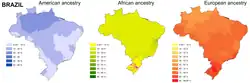 Der Großteil der brasilianischen Bevölkerung stammt von mehreren Hauptquellenpopulationen (entweder allein oder häufiger in unterschiedlichen Kombinationen in unterschiedlichem Ausmaß gemischt); frühe europäische Siedler (hauptsächlich ethnische Portugiesen), spätere Migranten aus Europa, dem Mittleren Osten und Asien, Nachkommen von Sklaven aus Afrika südlich der Sahara und indigene Völker in Brasilien (hauptsächlich Tupi und Guaraní, aber auch von anderen indigenen ethnischen Gruppen). Aufgrund der Durchmischung der Bevölkerung sind ethnische Kategorien weniger klar umrissen als in anderen Ländern und können auch stark subjektiv sein. Bei den Volkszählungen kann die Bevölkerung aus folgenden fünf ethnischen Kategorien zur Selbstidentifizierung wählen: Branco (Weiße), Pardo (Braune/Farbige), Preto (Schwarze), Amarelo (Gelbe/Asiaten) und Indígena (indigene). Ethnische Grenzen sind oft fließend, so dass viele Weiße in Brasilien nicht rein europäischer Abstammung sind und Schwarze meist nicht rein afrikanischer Abstammung. Laut der meisten Studien ist die Gesamtbevölkerung genetisch zu knapp zwei Dritteln europäischer Herkunft, wobei insgesamt weniger als zwei Drittel rein europäischer Abstammung sind. Laut einer genetischen Studie aus dem Jahre 2013 ist die Bevölkerung Brasiliens im Durchschnitt zu ca. 60 % europäischer Abstammung, zu ca. 25 % afrikanischer Abstammung und zu ca. 15 % indianischer Abstammung. Europäische Abstammungslinien sind am stärksten im Süden des Landes verbreitet mit 74 % und am wenigsten im Norden mit 51 %. Afrikanische Gene sind am stärksten im Nordosten verbreitet mit 28 % und am schwächsten im Süden mit 15 %. Indigene Abstammung ist am stärksten im dünn besiedelten Norden des Landes verbreitet mit 32 % und am schwächsten im Süden mit 11 %. Übergänge zwischen ethnischen Gruppen sind in Brasilien oft fließend, da die große Mehrheit der Bevölkerung von mehr als einer Bevölkerungsgruppe abstammt. So waren Brasilianer, die sich selbst als Weiße bezeichnen, zu 75 % europäischer Abstammung, während Brasilianer, die sich selbst als Schwarze bezeichnen, zu 58 % afrikanischer Abstammung waren.[23] Die meisten anderen Studien kommen zu vergleichbaren Ergebnissen.[24] Alle Studien zeigen zudem, dass die väterliche Abstammungslinie stärker europäisch geprägt ist als die mütterliche.[16]