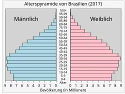 Die Demografie Brasiliens betrachtet die Bevölkerungsanzahl und -zusammensetzung in Brasilien. Mitte des Jahres 2020 hatte Brasilien 211,8 Millionen Einwohner und belegte damit den sechsten Platz in der Rangliste der bevölkerungsreichsten Staaten der Welt.[1] Brasilien ist außerdem das bevölkerungsreichste Land Südamerikas und das bevölkerungsreichste portugiesischsprachige Land. Mit einer Bevölkerungsdichte von 25 Einwohnern pro Quadratkilometern ist das Land relativ dünn besiedelt, da es eine kontinentale Ausdehnung hat und einer der weltgrößten Flächenstaaten ist. Seit der europäischen Kolonisation Amerikas ist die Bevölkerung des Landes stark gewachsen, zuerst durch Einwanderung und später vorwiegend durch natürliches Wachstum. Allein zwischen 1950 und 2020 vervierfachte sich die Bevölkerung von 51 Millionen auf über 200 Millionen. Inzwischen befindet sich Brasilien allerdings im demografischen Übergang. Wie auch in anderen Ländern steigen die allgemeine Lebenserwartung, das Bildungsniveau und die Urbanisierung; die zusammengefasste Fruchtbarkeitsziffer pro Frau ist dagegen von 6,1 Kindern im Jahr 1960 auf 1,7 Kinder im Jahr 2018 gesunken und liegt damit unter dem Niveau, das zur langfristigen Bestandserhaltung notwendig ist.[2] In derselben Zeit ging das jährliche Bevölkerungswachstum von 2,9 auf 0,8 Prozent zurück.[3] Für die Zukunft wird deshalb mit einer abflachenden und dann sinkenden Bevölkerungskurve gerechnet. Zugleich wird mit einer starken Alterung der Bevölkerung gerechnet: bis 2050 soll die Zahl der Einwohner über 60 Jahre von 24 auf 66 Millionen steigen.[4]