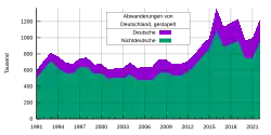 Nur durch Zuwanderung konnten Bevölkerungsrückang und Überalterung der Bevölkerung aufgrund des Geburtendefizits vermieden oder begrenzt werden. 2022 lag der Anteil der Menschen mit Migrationshintergrund bei 28,7 %.[10] Zu dieser Kategorie zählen Ausländer, Eingebürgerte, Spätaussiedler aus Osteuropa und deren Kinder.