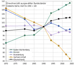 In den westdeutschen Bundesländern ging die Zahl der Geburten seit Ende der 1960er Jahre zurück (sog. Pillenknick). In der DDR war die Entwicklung zeitversetzt um etwa drei Jahre ähnlich, wenngleich die Geburtenraten im Osten ab 1969 höher waren als im Westen. Nach der Wiedervereinigung sank in Ostdeutschland die Geburtenrate um über % verglichen mit dem Vorwendeniveau.[19]