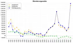 Die Binnen- und die Auswanderungsbewegungen waren im Jahrzehnt 2000 bis 2010 sehr unterschiedlich. De facto ist insgesamt ein Gleichstand mit den Vorjahren zu beobachten (Veränderung unter 0,1 Prozent, Wanderungssaldo). Mehr als 10 Millionen hier lebender Menschen waren laut Daten des Ausländerzentralregisters ausschließlich ausländische Staatsbürger (Stand: 12.2016). Rund 18,6 Millionen Einwohner Deutschlands hatten im Jahr 2016 einen Migrationshintergrund.[18]