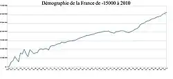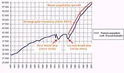 Zwischen 1931 und 1946 verzeichnen Volkszählungsergebnisse ein Sinken der Bevölkerung von 41,5 auf 40,1 Millionen Einwohner.[14] Frankreich erlebte nach 1945 schließlich eine deutliche Steigerung der Geburtenzahlen, der auch mit einem wirtschaftlichen Aufschwung zusammenfällt.[15] Ab den 1960er Jahren kehrten zudem mehr als eine Million Franzosen aus Algerien zurück und die Einwanderung nach Frankreich aus den ehemaligen Kolonien und Südeuropa stieg deutlich an. Seit 1975 hat sich das Bevölkerungswachstum in Frankreich erheblich verringert, ist aber immer noch etwas höher als im übrigen Europa und viel schneller als Ende des 19. Jahrhunderts und in der ersten Hälfte des 20. Jahrhunderts. So hat sich das Verhältnis inzwischen umgekehrt und Frankreichs Bevölkerung wächst schneller als der Rest Europas, nachdem es davor genau umgekehrt war.