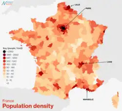 Das mit weitem Abstand größte Bevölkerungszentrum bildet der Ballungsraum Paris (Île-de-France) im Nordwesten des Landes mit etwa zwölf Millionen Einwohnern. Weiteren Zentren stellen die Mittelmeerküste mit den Hafenstädten Marseille und Nizza, der Großraum Lyon im Osten und die Region um Lille im Norden dar. Das Zentrum Frankreichs ist dagegen deutlich dünner besiedelt und erlebt seit Jahrhunderten Abwanderung in die städtischen Zentren. 2018 betrug die Urbanisierungsrate in Frankreich circa 80 % (1960 noch circa 60 %), womit Frankreich zu den stark urbanisierten Ländern gehört. Die Kernstadt von Paris ist außerdem die europäische Großstadt mit der höchsten Bevölkerungsdichte (etwa 20.000 Personen pro km²).