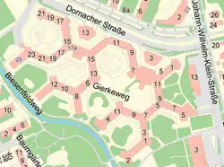 Die städtebauliche Lösung basiert auf einem sechseckigen Raster mit einer Seitenlänge von 43 Metern.[10] Die Knotenpunkte des Rasters sind gleichförmige Erschließungskerne mit Treppenhäusern und Aufzugsanlagen, die zwischen diesen Kernen liegenden 31 Baukörper oder „Häuser“ sind modular aufgebaut. So war es etwa möglich, noch spät in der Bauphase mehrere Standard-Wohnungen gegen Laubengang-Module zu tauschen, die als Maisonette-Wohnungen gestaltet waren. Auch zeigte sich im Mitbestimmungsprozess ein großes Interesse an Dachgeschoßwohnungen mit Terrassen, deren Anzahl von 20 auf 96 erhöht werden konnte.[11] Fest eingeplant war von Beginn an ein Besucherwohnheim und die Bespielung der Erdgeschoßzonen mit Versorgungs- und Infrastruktureinrichtungen: