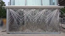 - Kinetische Hüllen passen sich den Lichtverhältnissen außerhalb der Fassade an und können so zur Verbesserung der Raumbeleuchtung im Innenraum beitragen.[5] Bei diesen Hüllen handelt es sich um textile Sonnenschutzelemente, die sich je nach Lichteinfall auffalten und wieder zusammenlegen können.[8] Sie bewirken auch eine Verringerung des Strahlungseintrags in den Stadtraum.[5]
