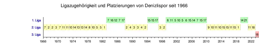 Am Ende der Saison 1987/88 stieg man nach fünf Jahren in der höchsten türkischen Liga wieder in die Zweitklassigkeit ab.[11] Nach sechs Spielzeiten in der zweiten Liga erfolgte als Vizemeister in der Saison 1993/94 erneut der Aufstieg in die höchste Liga.[12] Man konnte jedoch nur zwei Saisons die Klasse halten, sodass man nach drei schwachen Spielzeiten erneut in die zweite Liga abstieg. So kurz wie der Aufenthalt in der ersten Liga war, umso schneller gelang die Rückkehr in das Oberhaus. In der Saison 1997/98 verpasste man den Aufstieg nur knapp, als man erst in den Play-offs scheiterte. Eine Saison später stieg man als Vizemeister, punktgleich mit dem Meister Vanspor, in die erste Liga auf, sodass Denizlispor nach zweijähriger Abstinenz wieder am Wettbewerb der 1. Lig teilnahm.[13]