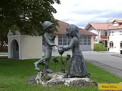 Vor der Kirche steht ein steinernes Kriegerdenkmal von 1957, das einen Engel zeigt, der einen sterbenden Soldaten tröstet, geschaffen von Barthel Mes aus Ingolstadt.