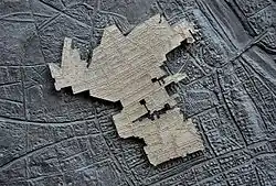 aus einer Bronzetafel mit der Größe 60 × 70 cm, auf der die Karte mit den weitesten Grenzpunkten des Ghettos, das Vorkriegs-Straßennetz auf einer Karte von Warschau und die Stecknadel, die den genauen Standort des markierten Gedenkorts angibt, angezeigt werden