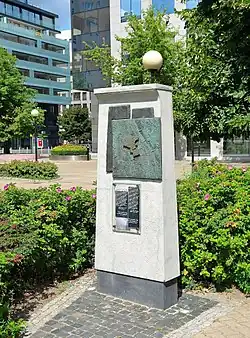 Die Gedenkplatten am Fußweg in der Nähe vom Kultur- und Wissenschaftspalast zeigen den Verlauf der GhettomauerGeneral-Władysław-Anders-Straße, an der Ecke der Świętojerska-Straße – das Denkmal erinnert an eines der wichtigsten Tore zum Ghetto, das sich in der ehemaligen Nalewki-Straße befand. Durch dieses Tor kamen um 5:30 Uhr morgens am 19. April 1943 die deutschen Truppen in Kooperation mit den lettischen und ukrainischen Truppen unter Ferdinand von Sammern-Frankenegg ins Ghetto und begegneten dem bewaffneten Widerstand der jüdischen Kämpfer.[5] Diese Kämpfe lösten den Aufstand im Warschauer Ghetto aus.