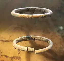 Die Ringe waren ursprünglich mit Bast umwickelt. Einer weist in regelmäßigen Abständen drei Löcher auf.