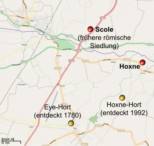 : Ortschaften Hoxne und Scole (letztere eine frühere römische Siedlung). Die rot eingezeichnete Straße entspricht dem Verlauf einer früheren RömerstraßeVor diesem historischen Hintergrund ist die Deponierung des Schatzes von Hoxne zu sehen. Wohlhabende Personen konnten sich bei diesem Zusammenbruch der bisherigen staatlichen Ordnung ihrer Privilegien und ihres Besitzes nicht mehr sicher sein und versuchten, ihre Besitztümer an einen sicheren Ort zu bringen. Möglicherweise hatten sie dann später keine Gelegenheit mehr, den Schatz erneut zu heben, und das Wissen um die versteckten Reichtümer ging verloren. Eine andere Möglichkeit ist, dass es sich bei dem Hort um das Versteck eines Raubes handelt. In ganz England finden sich ähnliche Schatzfunde aus dieser Zeitepoche. Mehr als 95 derartige Funde sind bekannt. Der Fund von Hoxne ist vor allem durch seinen großen Umfang bemerkenswert. Alle anderen eindeutig dokumentierten derartigen Funde umfassten maximal nur wenige 100 Münzen.[5] Der umfangreichste Fund an Goldmünzen, der je auf den Britischen Inseln gemacht wurde, war der Schatzfund von Eye, nur wenige Kilometer von Hoxne entfernt, der im Jahr 1780 entdeckt wurde.[5][9] Dieser Fund umfasste etwa 650 Goldmünzen aus den Regierungszeiten der Kaiser Valentinian I. (364–375), Honorius (393–423) und Konstantin III. (407–411), die jedoch nicht archäologisch dokumentiert wurden, so dass der Zusammenhang mit dem Depotfund von Hoxne unklar bleibt. Möglicherweise handelt es sich bei beiden Funden um Teile eines größeren Schatzes.[5] Auch über den umfangreichen Schatzfund von Cleeve Prior in Worcestershire aus dem Jahr 1811, der ungefähr 3.000 Silbermünzen und etwa 500 Goldmünzen aus derselben Zeitepoche umfasst haben soll und damit der umfangreichste Silbermünzen-Fund im ganzen Römischen Reich aus dieser Zeit gewesen wäre, ist aufgrund fehlender wissenschaftlicher Aufarbeitung wenig bekannt.[5]
