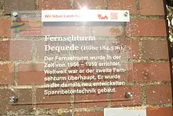 Südlich des Dorfes steht der 184,5 Meter hohe Fernsehturm Dequede. Der Turm ist nicht öffentlich zugänglich. Er wurde zwischen 1956 und 1959 als Fernseh- und Richtfunkturm errichtet. Heinz Wenisch, der 36 Jahre lang Leiter des Einrichtung war, berichtete 2014 in einem Zeitungsinterview, warum der Turm in Dequede gebaut wurde. Zu der Zeit wurde eine Betriebsstelle, also ein Sender, für das Fernseh- und UKW-Netz in der Altmark benötigt. Durch den Bau wurde der Richtfunkring von Rostock über Schwerin bis nach Berlin geschlossen. Später entstand eine grenznahe Übergabestelle für Intervision und Eurovision. Bereits in den 1980er Jahren war durch die Automatisierung eine personelle Überwachung vor Ort nicht mehr nötig.[14] Der Turm ähnelt dem 1956 errichteten Stuttgarter Fernsehturm.