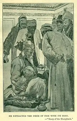 Ein Schneider lädt abends einen buckligen Spaßmacher ein. Beim Essen stopft er ihm Fisch in den Mund und er erstickt an der Gräte. Erschrocken tragen seine Frau und er den Toten zum Arzt und lassen ihn da auf der Treppe stehen. Der Arzt stolpert drüber, meint dann, er hätte ihn getötet, und lässt ihn vom Dach ins Haus des Küchenchefs herab. Der hält ihn für einen Vorratsdieb, schlägt ihn mit dem Hammer und trägt ihn in eine Ecke des Basars. Ein betrunkener Makler pinkelt da, meint, der wolle ihm den Turban runterreißen, haut zu und ruft den Nachtwächter, der ihn zum Wadi bringt. Er soll gehängt werden, da laufen nacheinander der Küchenchef, der Arzt und der Schneider herzu und jeder gesteht, dass er es war. Der König vermisst seinen buckligen Freund, hört davon und lässt sich erzählen.