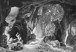 Alberich ist inzwischen der Herrscher der Nibelungen geworden und lebt mit seinem Volk in den Tiefen der Erde.[18] Wotan und Loge treffen zuerst auf Mime, den Bruder Alberichs und meisterlichen Schmied. Ihn hat Alberich durch die Kraft des Rings gezwungen, einen Tarnhelm zu schmieden, mit dem er (Alberich) jetzt überall gegenwärtig ist und alle Nibelungen, auch Mime, zur Arbeit anpeitscht, damit sie ihm den Nibelungen-Hort aufhäufen. Als Wotan und Loge eintreffen, stöhnt Mime noch von den Schlägen des Bruders, der sich nach Belieben unsichtbar („Nacht und Nebel, niemand gleich“) machen kann.