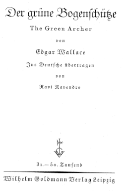 - ↑ Edgar Wallace: Der grüne Bogenschütze. Auflage VIII, Goldmann Taschenkrimi, o. J.; S. 49.