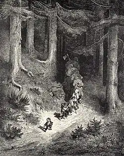 Die Kinder werden in den Wald geführt. Stich von Gustave Doré (1867).