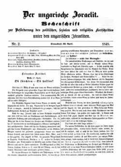 - ↑ Was wir sollen und was wir wollen. In: Der ungarische Israelit. 15. April 1848, abgerufen am 14. Oktober 2021.
